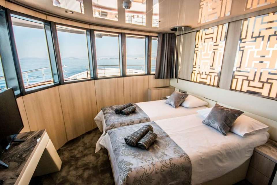 Este yate puede recibir hasta 36 pasajeros gracias a sus 18 cabinas climatizadas. Cada cabina cuenta con un televisor, una caja fuerte personal, un sistema de alarma de urgencia, detectores de humo y baño privado. Las cabinas fueron creadas para que disfrutes al máximo y en la mayor comodidad posible de tu crucero.